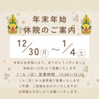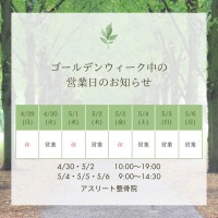 平素より格別のご愛顧を賜り厚く御礼申し上げます。本年もアスリート整骨院にご来院くださり誠にありがとうございました。年末年始の休院日12月30日(火)~1月4日(日)1月5日(月)より通常通り営業いたします。ご不...