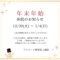 平素より格別のご愛顧を賜り厚く御礼申し上げます。本年もアスリート整骨院にご来院くださり誠にありがとうございました。年末年始の休院日12月30日(月)~1月4日(土)1月5日(日)13:00より営業いたします。1月6日(...